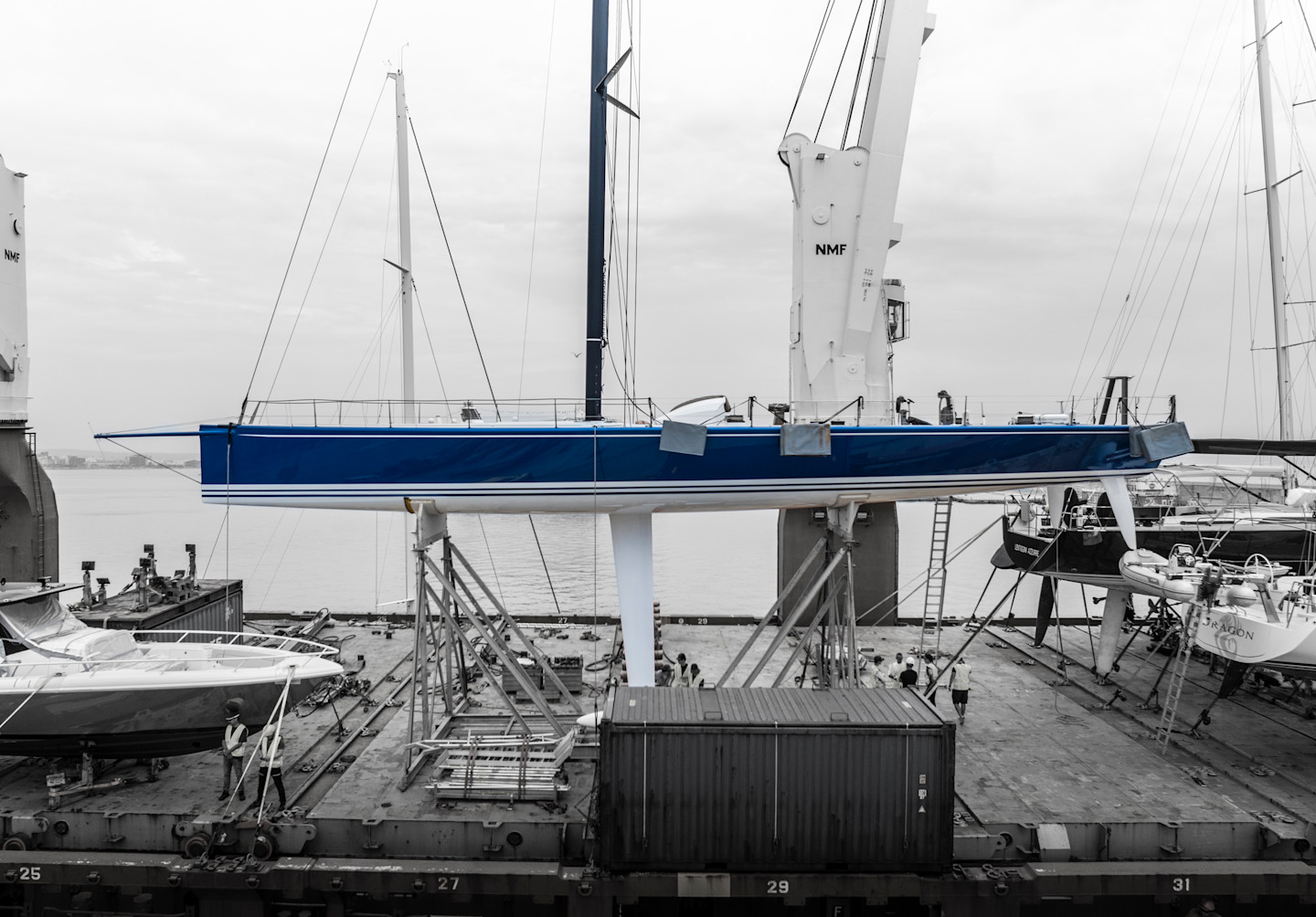 Sevenstar transports a variety of yachts, from 6.5-meter sailboats to 34-meter superyachts. Currently, about 60% of the fleet consists of motor yachts, while 40% are sailing yachts. Each vessel receives a custom stow-and-lift plan created by Sevenstar’s in-house technical team to ensure safe handling throughout the entire journey. Sevenstar collects detailed technical drawings from each yacht’s owner or builder, showing reinforcement locations. The technical team then develops tailored lifting and cradling plans for every yacht. Race yachts are more delicate and often have their own cradles. Sevenstar also maintains an internal database of hundreds of past lift plans, enabling the team to draw on previous experiences with similar boats. It’s a collaborative effort with the owner to maximize safety.